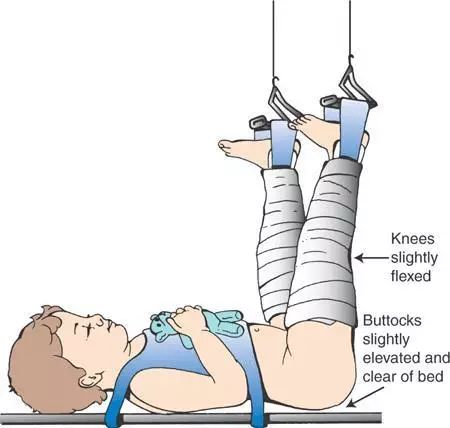 婴幼儿的股骨骨折使用下肢 Gallows 牵引或称 Bryant's 牵引,原理相同(图 9)。需要把婴幼儿双下肢均使用皮牵引,向上抬起,使臀部抬离床面。在牵引过程中应高度关注下肢血运情况变化。