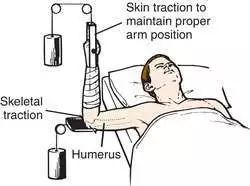 即常见的上肢牵引术,多用于肱骨骨折。上臂远端行骨牵引用于肱骨近段或中段骨折;前臂 90 度皮牵引用于肱骨髁上骨折或肘关节周围骨折(图 4)。