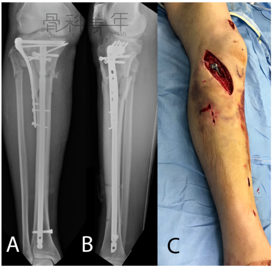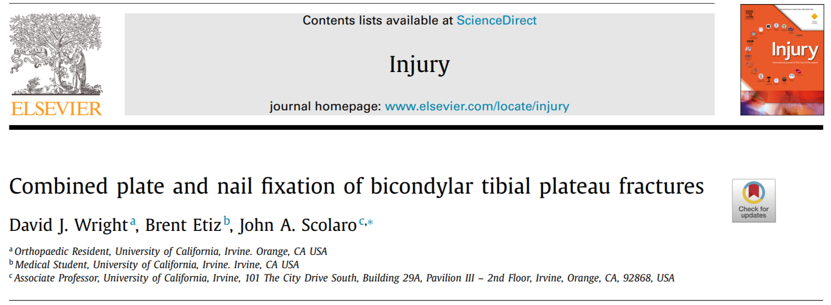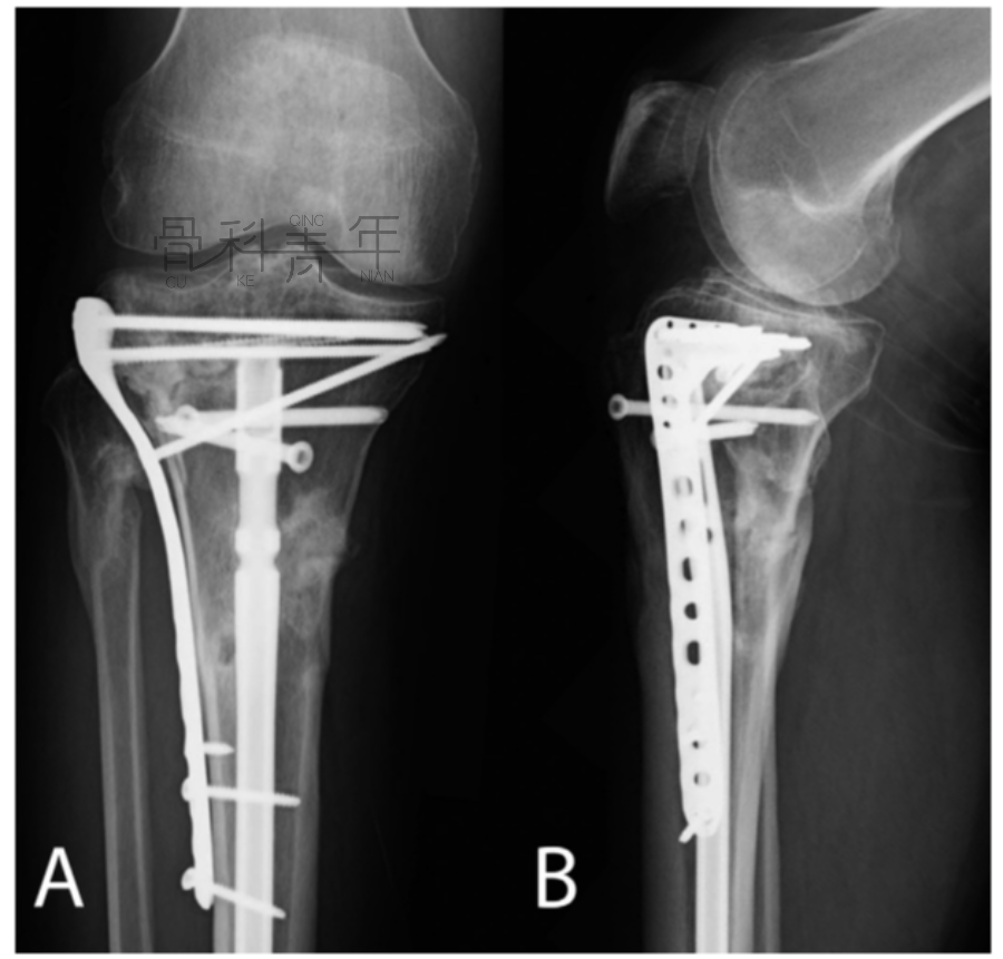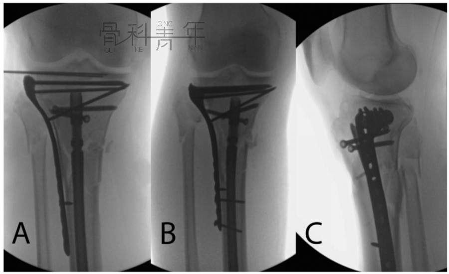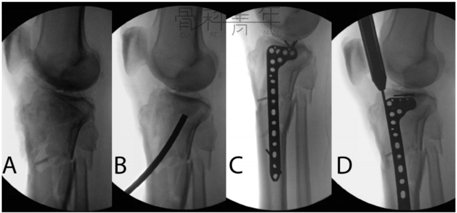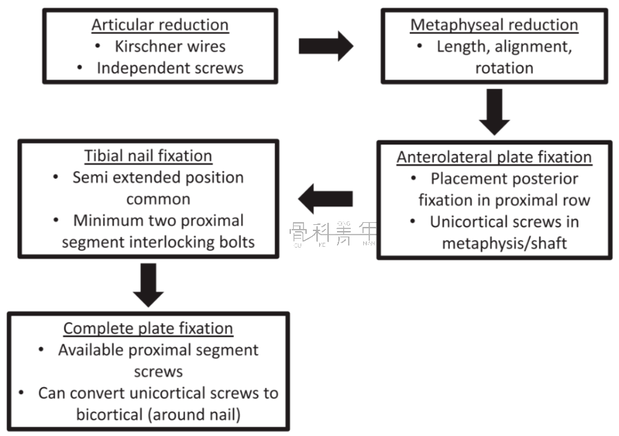 胫骨平台双髁伴干骺端粉碎骨折通常伴有严重软组织损伤。联合钢板-髓内钉固定是一种新兴技术,它利用有限前外侧入路进行钢板应用,并通过经皮切口置入髓内钉。这项技术减少了对胫骨近端单独内侧入路的需求。