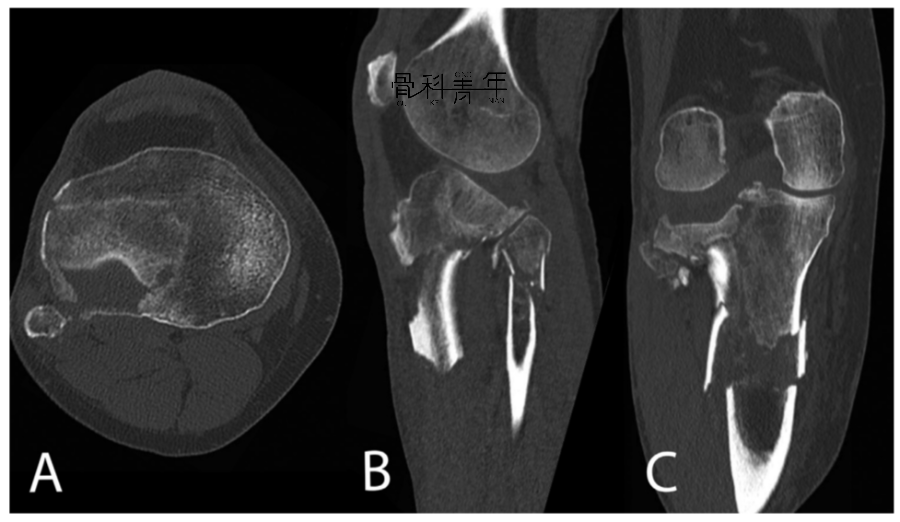图3 术前CT横断(A)、矢状位(B)和冠状位(C)可见外侧平台塌陷的双髁骨折,干骺端粉碎。