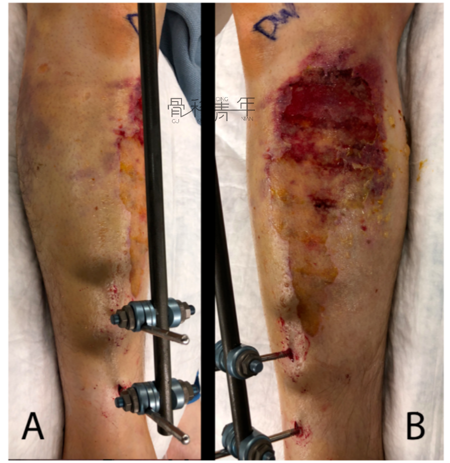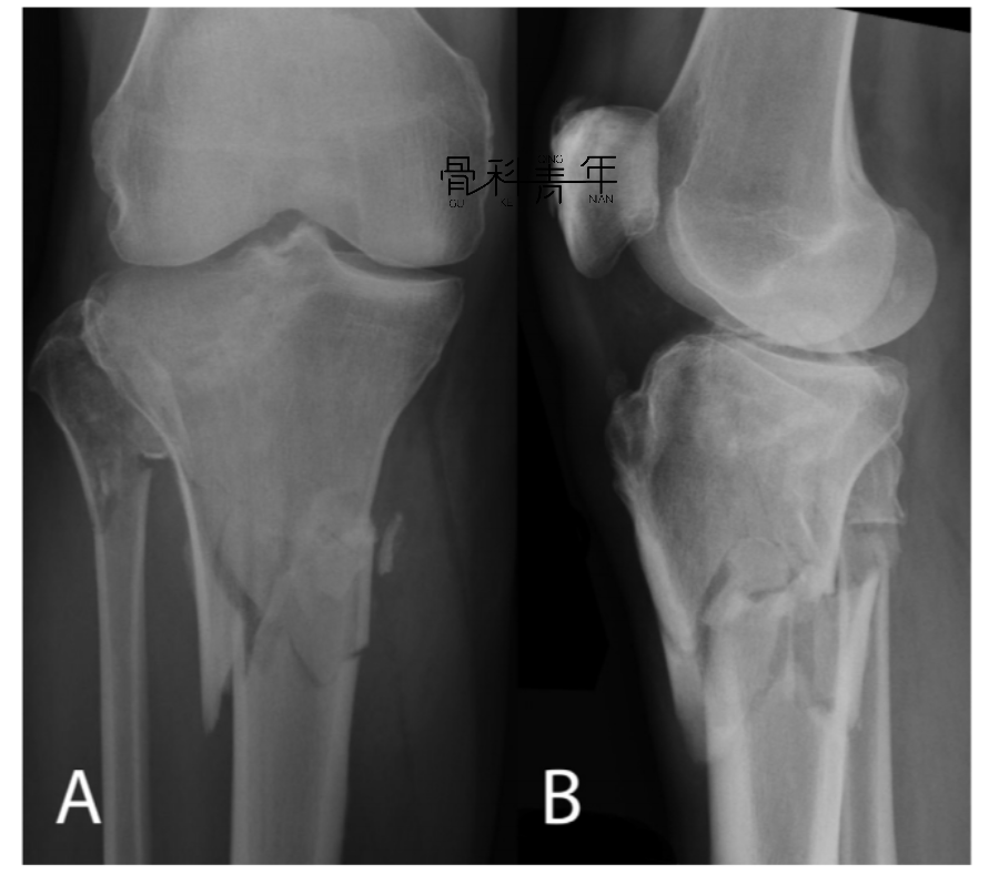 图1 1例41岁男性患者,车祸伤,可见干骺端粉碎骨折,合并外侧平台塌陷的双髁骨折。