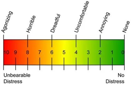 0为无痛,1-3为轻度疼痛(疼痛尚不影响睡眠),4-6为中度疼痛,7-9为重度疼痛(不能入睡或睡眠中痛醒),10为剧痛 。