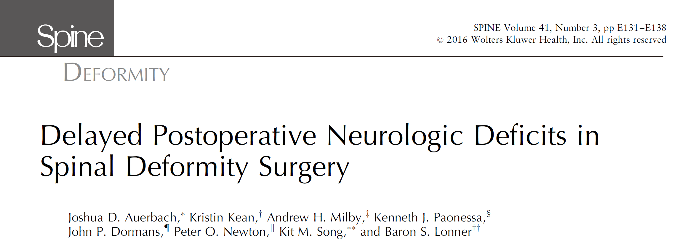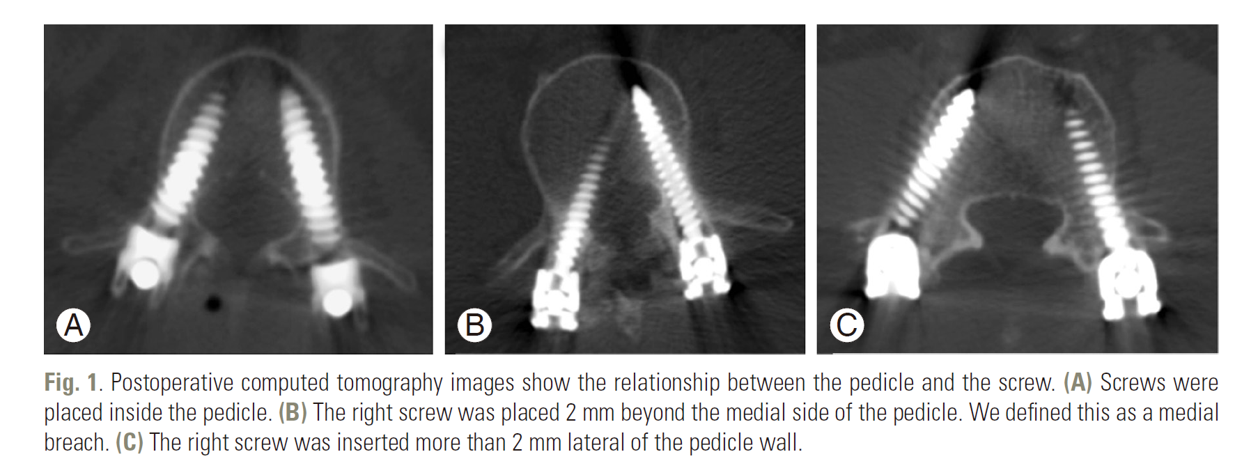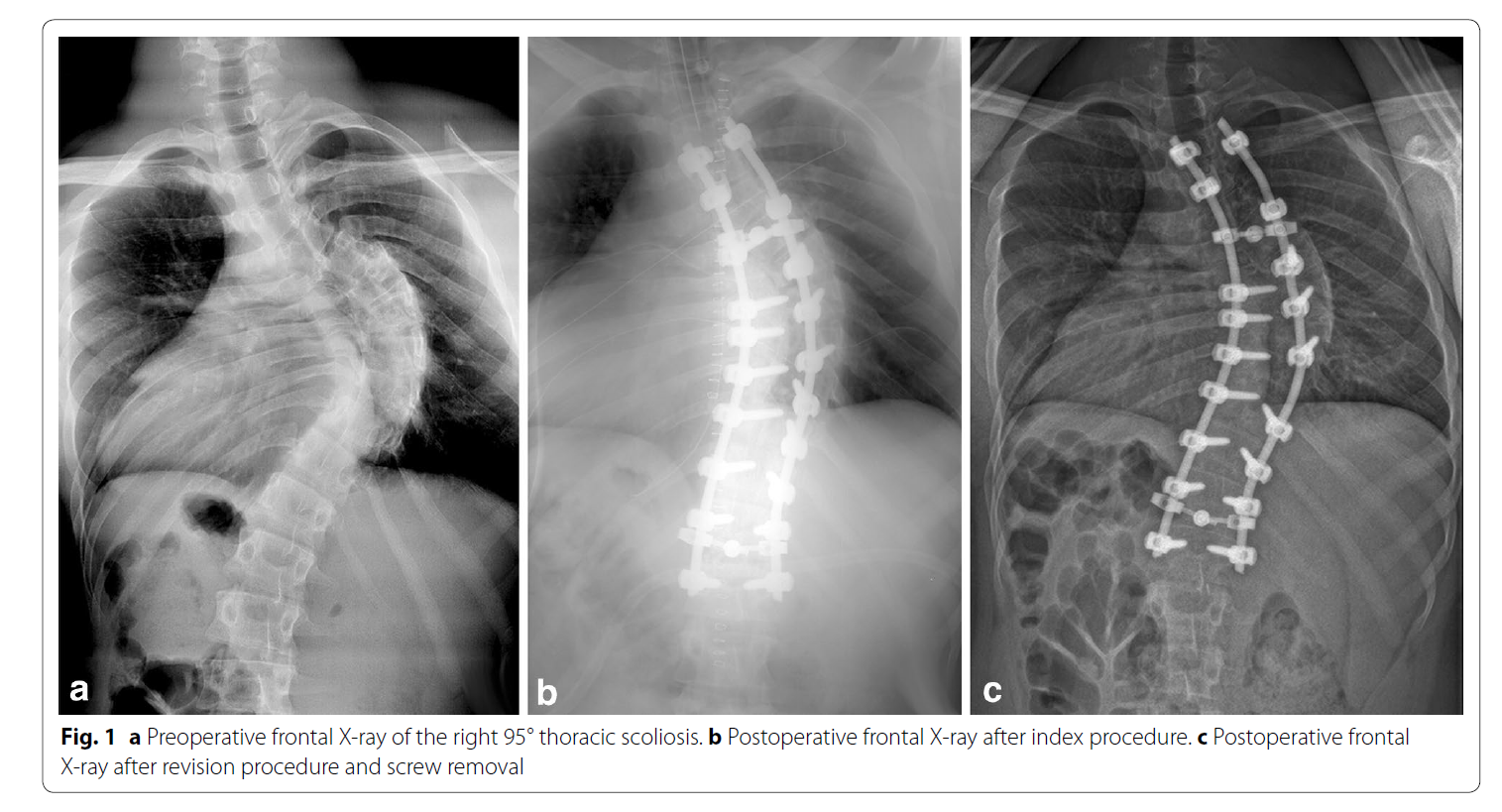 评论。此例病人T5左侧是凹侧,脊髓也应该靠近左侧的凹侧,左侧钉子完全进入椎管,理论上钉子应该横断了脊髓,而不只是压迫。但病人没有神经症状,有些不好理解。虽然有矢状位MRI,但没有轴位片,文中钉子和脊髓的关系实际上没有明确。最引起读者好奇心的地方没有交待,作者和reviewer都该面壁。但无论如何,还是长了见识,以后置钉应该更加谨慎。