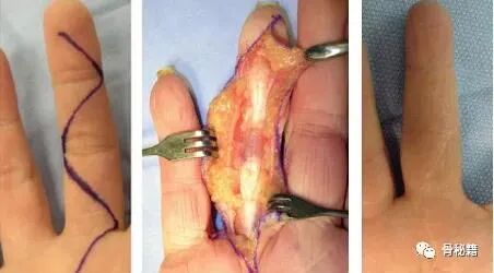 纵向切口,而没有限制性疤痕的风险。如果需要,也可以在手上使用横向和曲线切口。手上的皮肤是可移动的,疤痕通常不是功能问题,因为屈肌腱是主要力量,将最大限度地减少功能缺陷。