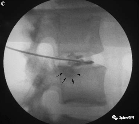 症状性或疼痛性Schmorl结节 (symptomatic or painful Schmorl’s nodes)在MRI T1WI上表现为Schmorl结节周缘呈低信号,而在T2WI和抑脂像上呈明显的高信号[1,2];椎间盘造影时,可见造影剂流入Schmorl结节内且诱发疼痛复制[2-4]。症状性Schmorl结节周缘穿刺活检可见大量炎症细胞浸润和骨髓水肿反应[1]。