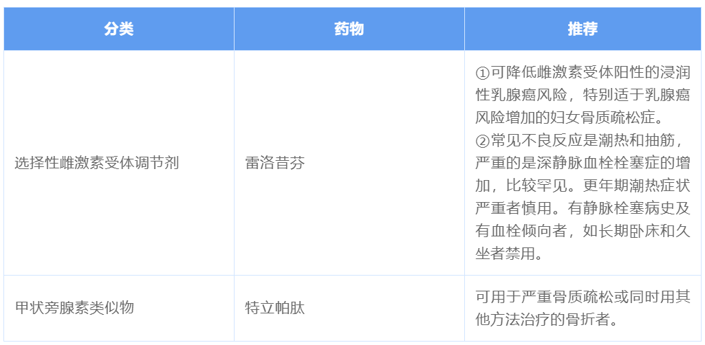 《ENDO绝经后女性骨质疏松症的药物治疗临床实践指南》(2019年)中指出,骨折风险高的绝经后女性,初始治疗可选用双膦酸盐类药物、地舒单抗或特立帕肽,以上不能耐受或不能获得,也可用SERMs、降钙素类药物等。