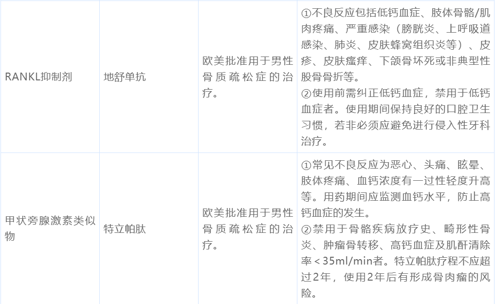 此外,欧美国家批准用于男性OP治疗药物还包括利塞膦酸钠、地舒单抗、特立帕肽。