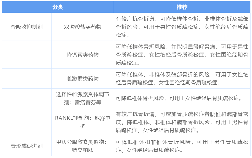 抗骨质疏松症药物包括骨健康基本补充剂如钙剂与维生素D,骨吸收抑制剂如双膦酸盐类药物、降钙素类药物、雌激素类药物、选择性雌激素受体调节剂(SERMs)、特异性核因子-κB受体活化因子配体(RANKL)抑制剂,骨形成促进剂甲状旁腺激素类似物(PTHa),双重作用机制药物如活性维生素D及其类似物、维生素K2类药物、锶盐类药物等。