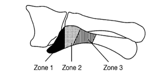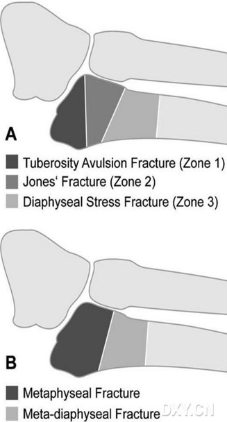- Ⅱ区:骨折是干骺端与骨干连接部骨折,又称Jones骨折,因血运原因容易发生不愈合;