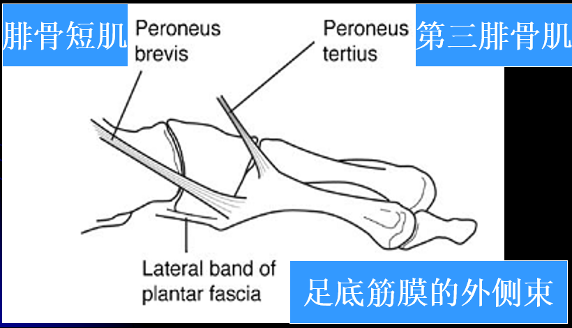 ① 第三腓骨肌腱,止于跖骨干部; ② 腓骨短肌腱,止于跖骨粗隆部;③ 跖腱膜的外侧束止于跖骨尖部。