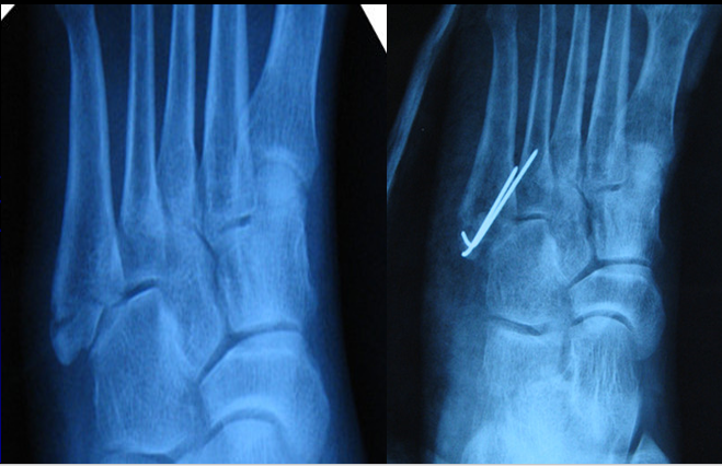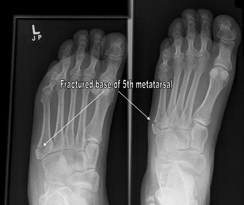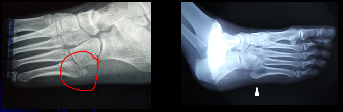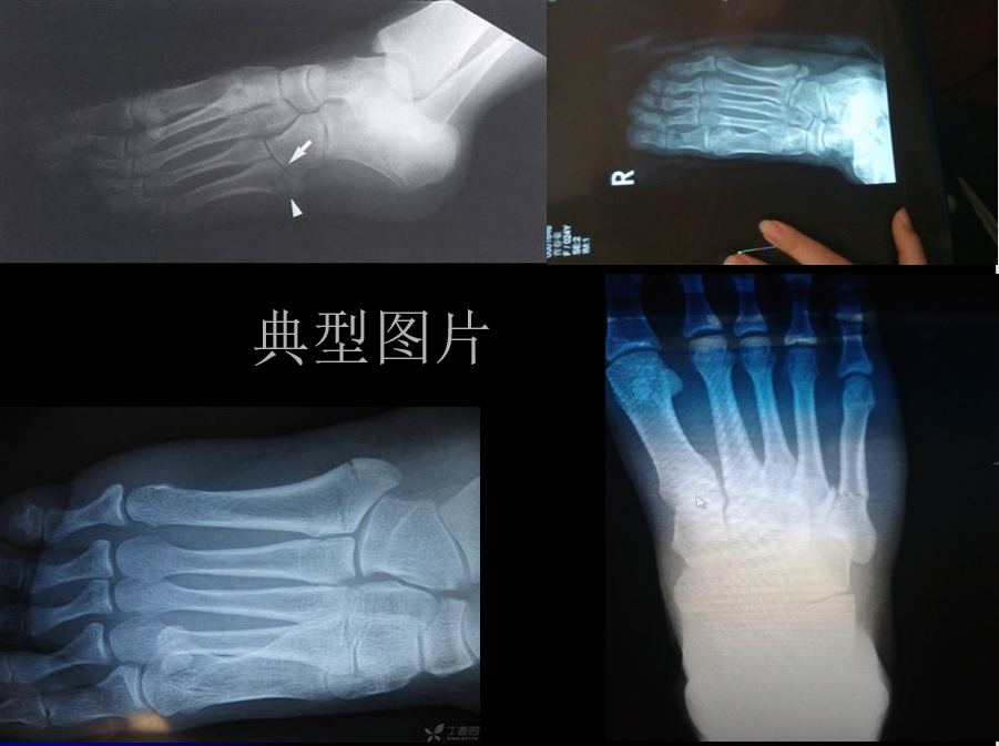 - 2型:是从第五跖骨基底到第五跖骨-骰骨关节面的斜形骨折;