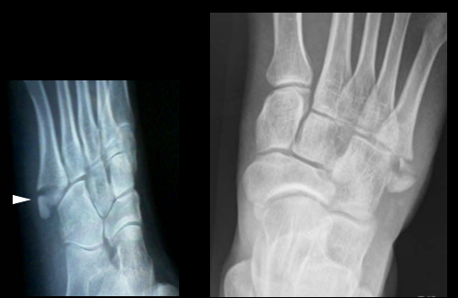 其损伤机制主要是前足的内翻和 (或) 暴力内收时的肌腱牵拉,常与踝关节外侧副韧带损伤伴随出现,也常发于外踝尖部撕脱骨折:①、跖腱膜的外侧束所致 - 明显移位的几率小②、腓骨短肌腱引起 - 其移位的几率较大