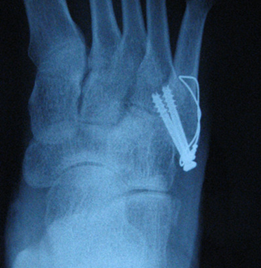 操作要点:直径以2.7 mm螺钉为宜,钉头要做埋头处理以免刺激皮肤,且在第四、五跖骨间连接以远穿出对侧骨皮质,这样生物力学强度最佳。