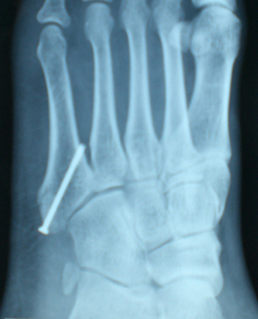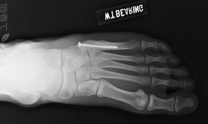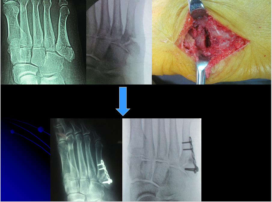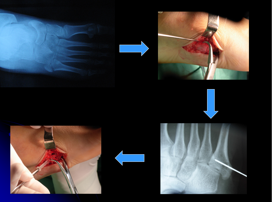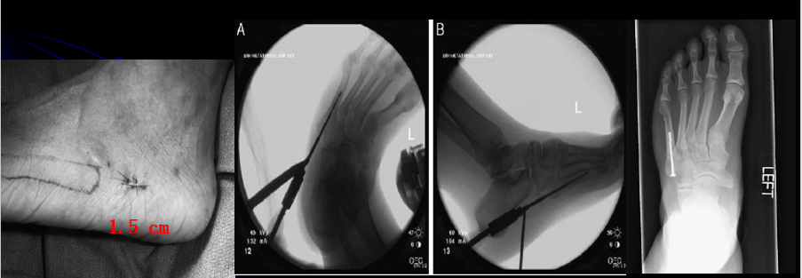 操作要点:操作要在透视监视下进行,且导针一定要从尖端打入,且在第四、五跖骨间连接以远穿出对侧骨皮质,这样生物力学强度最佳。
