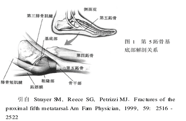DeVries 等在10个冷冻尸体标本模拟第五跖骨基底部骨折,他们建议,足底筋膜的外侧束所致的Ⅰ区骨折,或许可以采用外固定和负重等保守治疗。对于由腓骨短肌腱引起II区和Ⅲ区骨折,可能需要进行严格的固定和非负重或切开复位内固定治疗。