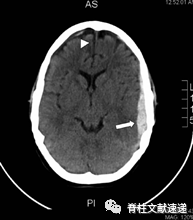 图注:40岁女性,既往多次腰椎手术史,再行翻修手术中发现发现硬膜缺损并给予修复。术后三周,病人出现进行性头痛。腰椎磁共振成像显示术区积液。再次手术探查,但未见渗漏。患者头痛持续,术后24小时进行CT扫描,显示右侧硬脑膜下血肿(SDH),中线移位。病人接受紧急颅骨切开引流减压。随访CT显示SDH恢复良好。
