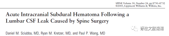 3、文献回顾22例脊柱术后SDH患者,45.4%(10/22)行发生硬膜切开/撕裂。从手术到术后诊断SDH的平均时间为9.9天,患者的平均年龄为56.4岁(25-82岁)