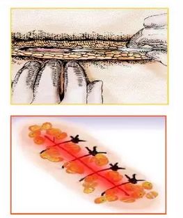 【延期缝合】:小伤口可使用二期愈合,指将伤口有意保持开放,经过一段时间,肉芽组织填充伤口,最终上皮形成。这一过程中不采用外部手段将皮肤边缘对合。