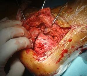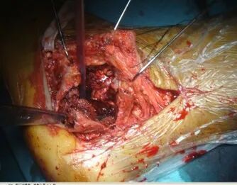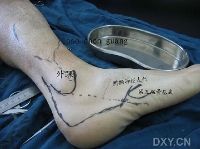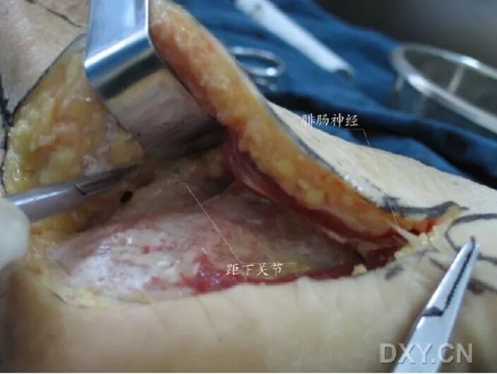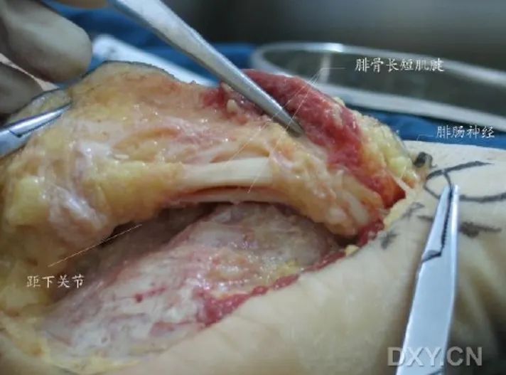 手术刀要一刀见骨,将骨膜连同软组织以及腓骨长短肌肌腱一起向上掀起。