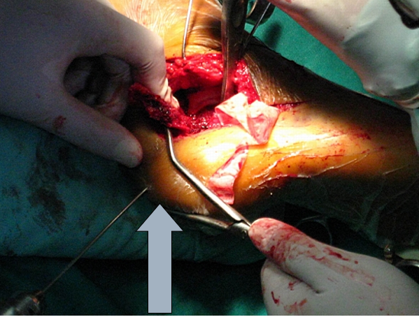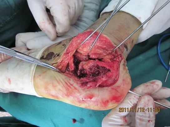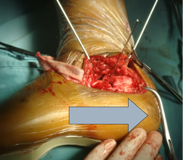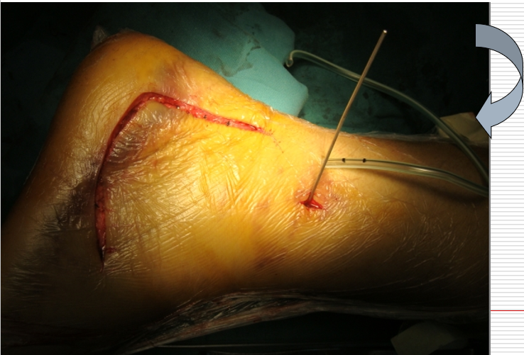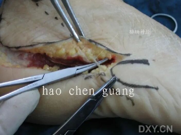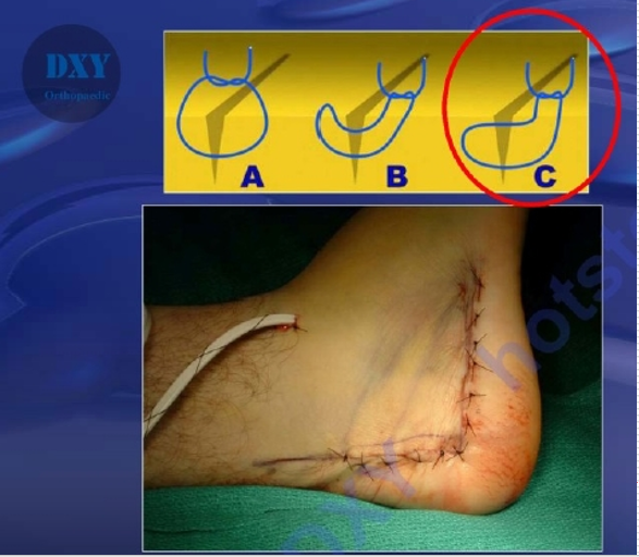 我们的方法是:大巾钳位于跟骨结节上方,向下后牵引跟腱