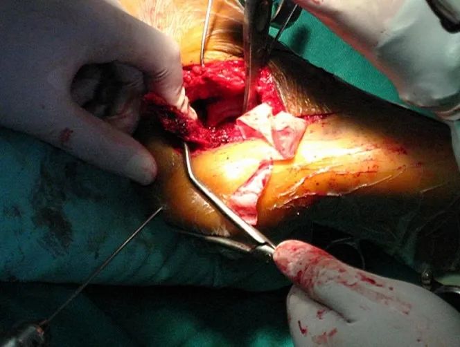 切开皮肤后开始用7号丝线协助牵开