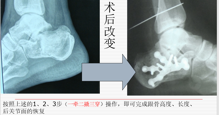 按照上述的1、2、3步(一牵二撬三穿)操作,即可完成跟骨高度、长度、后关节面的恢复。