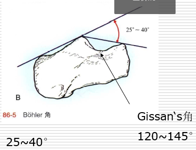 Bohler’s角:缩小、消失或反角,反映后关节面的塌陷Gissan‘s角:反映跟距关节内骨折的严重程度