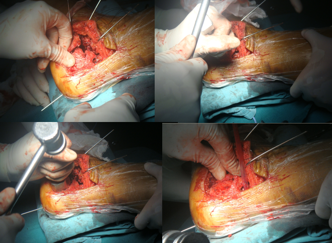 采取外侧入路。丝线与克氏针协助显露。采用“一牵、二撬、三穿、四捶”的手术操作。