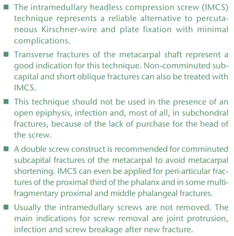 - 对于掌骨粉碎性头下骨折,建议使用双螺钉结构以避免掌骨缩短。IMCS 甚至可以应用于指骨近1/3的关节周围骨折和近端/中指骨骨折的多段骨折。