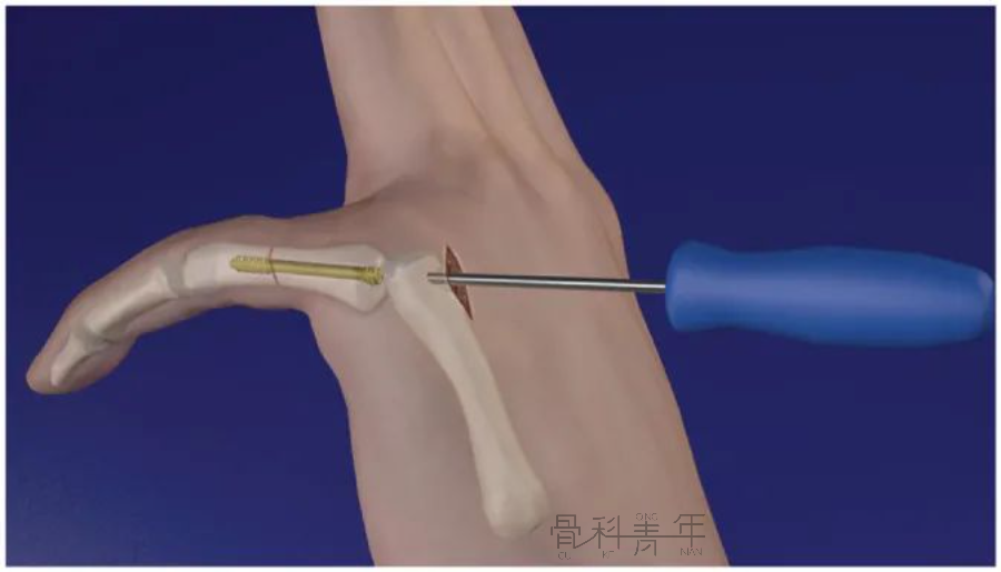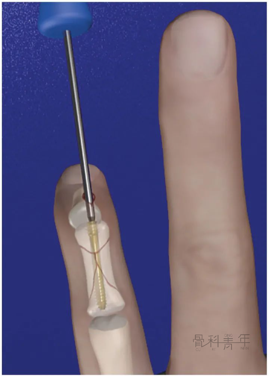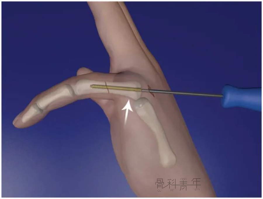 图3 近节指骨的顺行无头加压螺钉(IMCS)固定。2.顺行经关节技术当近节指骨无法实现足够的背侧半脱位或导丝位置不理想时,建议采用经关节技术。在MCP上作一长3.0mm的切口,屈曲 90°。导丝插入掌骨头的背侧。然后将导丝通过掌骨推进到近节指骨的远端(图 4)。