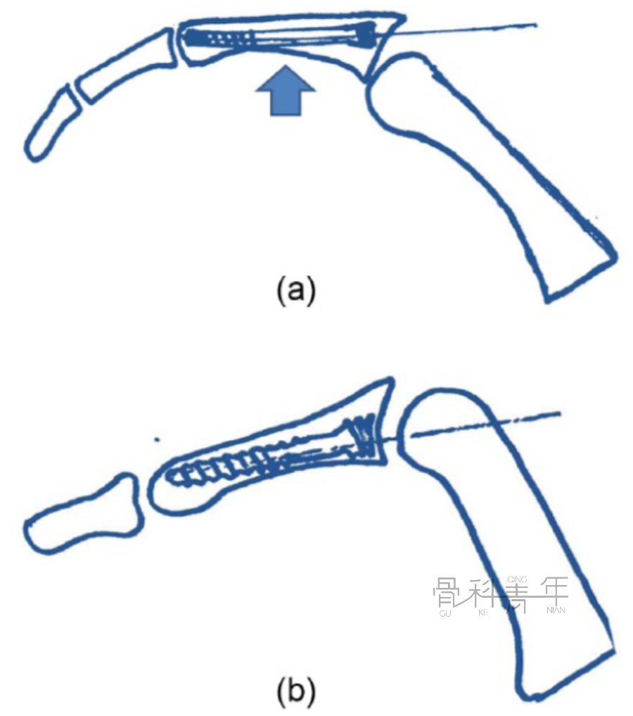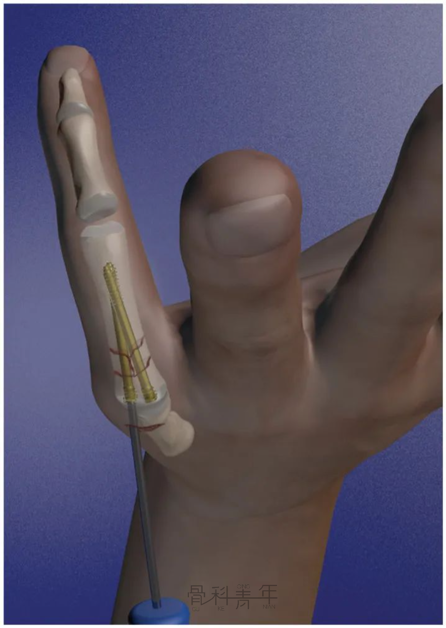 图5 经关节内与顺行经关节固定模式图。3.逆行经关节内技术除顺行置入螺钉外,也可通过近指间关节逆行置入IMCS。在屈曲 90° 的近端指间 (PIP) 关节上做一个 3.0 mm的切口。然后将导丝沿其纵轴推进到近节指骨的基底部(图 6)。该技术操作较为简单,但同样存在损伤指骨远端关节面软骨风险,同时容易损伤伸肌腱。