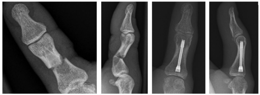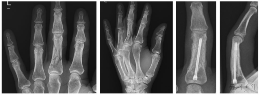 图8 近节指骨粉碎骨折的单枚螺钉固定。