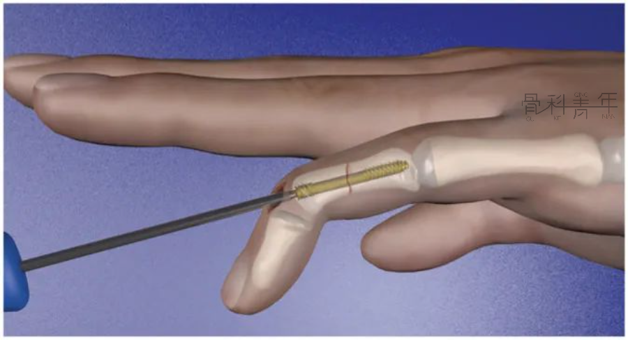 图4 近节指骨顺行髓内无头加压螺钉 (IMCS) 固定的经关节技术(通过掌骨头)。该技术的缺点在于会损伤掌骨头的软骨和近节指骨的基底部。