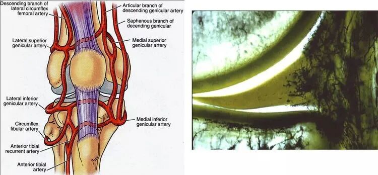 - 半月板旁的毛细血管网起源于膝动脉的内下和外下分支