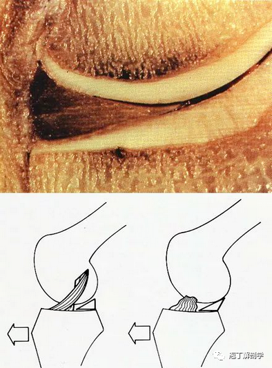 破裂:半月板位于胫股关节间隙间大小不匹配——盘状半月板、宽大半月板胫股关节过度移动挤压、研磨,致半月板撕裂——关节不稳,外伤超出半月板正常活动范围