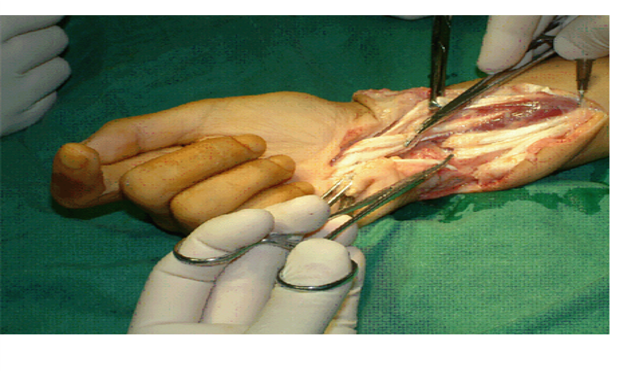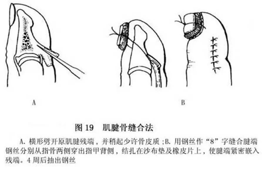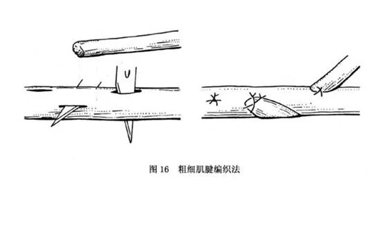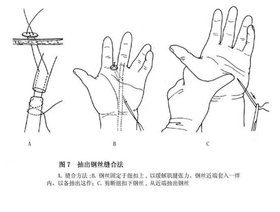 - 选用36#~38#钢丝或5-0无创伤钢丝肌腱缝合线。肌腱近断端用“8”字缝合,经肌腱远端穿出皮肤并用纽扣固定在皮肤表面,以减少肌腱断端结合部张力。4周后.用剪刀将纽扣下的钢丝剪断,从近端将钢丝抽出。