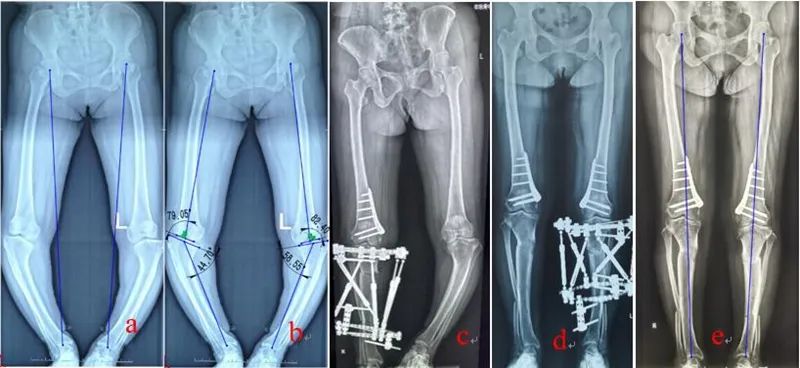 图3:QSF结合内固定治疗双侧Blount病 a:术前双下肢力线;b:畸形分析:股骨外翻,胫骨内翻、内旋、短缩;c、右侧股骨远端闭合截骨即时矫正内固定、六轴外架缓慢矫正胫骨畸形;d:左侧股骨远端内侧闭合截骨即时矫正内固定、六轴外架缓慢矫正胫骨畸形;e:双侧矫形术后,力线恢复良好,内旋纠正,双下肢等长。