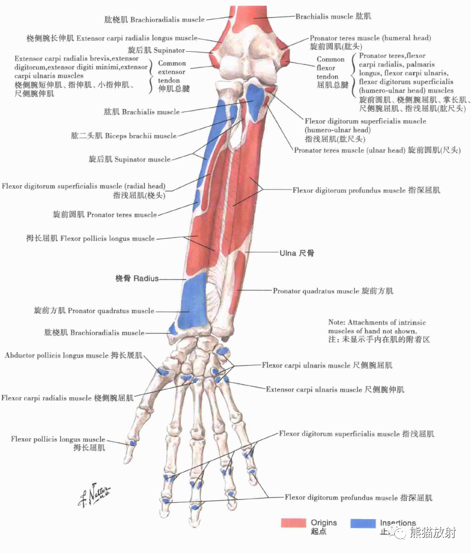 前臂:肌附着区(前面观、后面观)