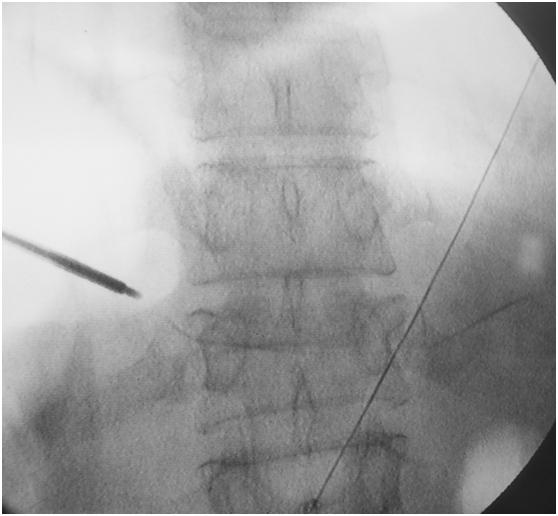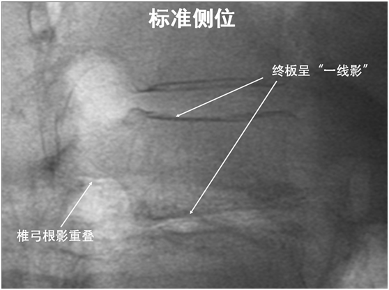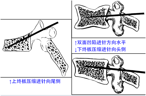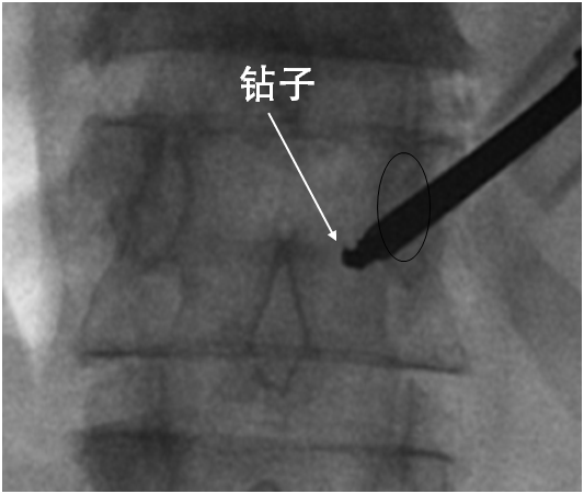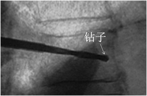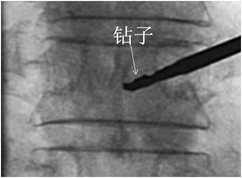 侧位相钻子直至椎体前中1/2交界处,正位钻头尖位于椎弓根影与棘突连线中点。