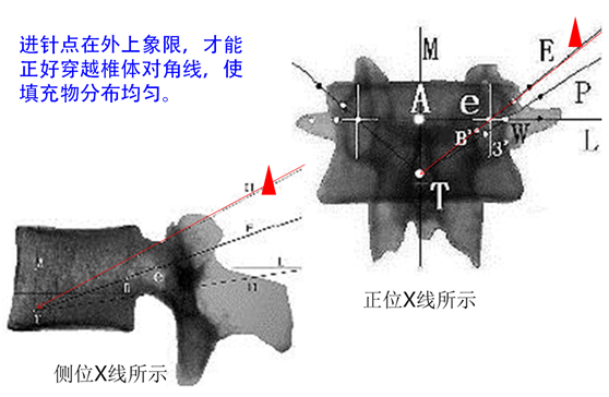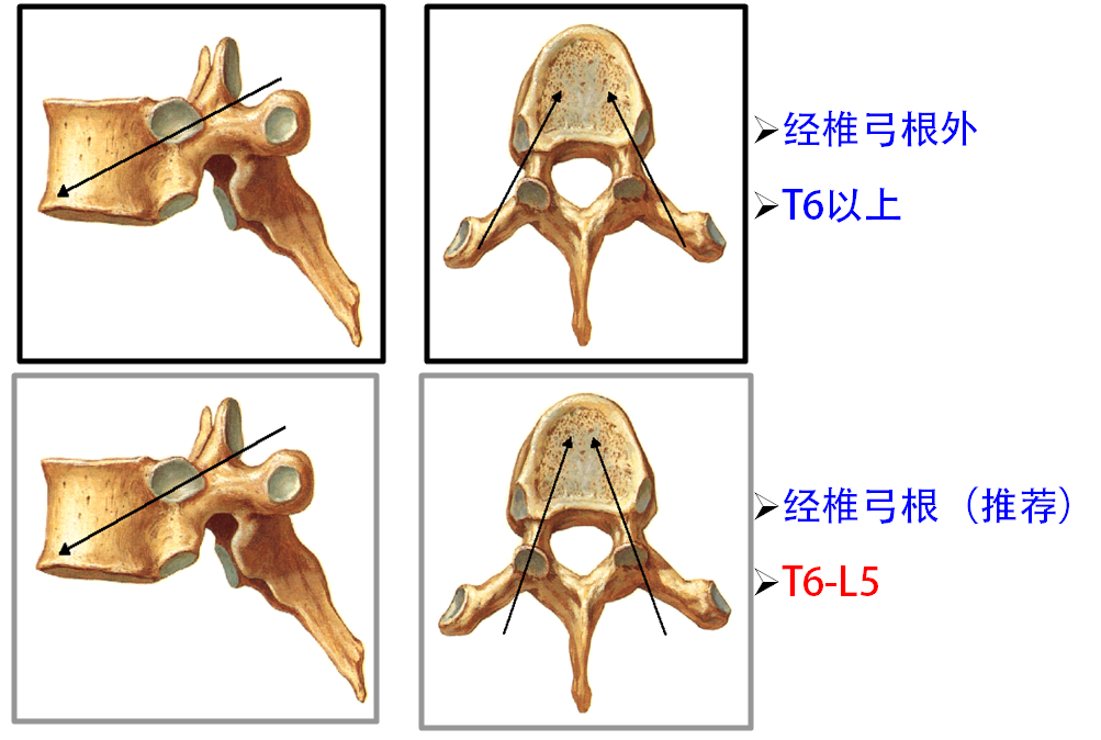 经椎弓根途径,一般为胸腰椎穿刺途径,建议适于T6以下(视实际椎弓根粗细而定),可有效避免血管神经损伤,有效防止填充剂向椎旁渗漏。进针方向为2点钟,15~20度角。