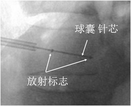 球囊置入伤椎,导管上金色标记全部进入外鞘。