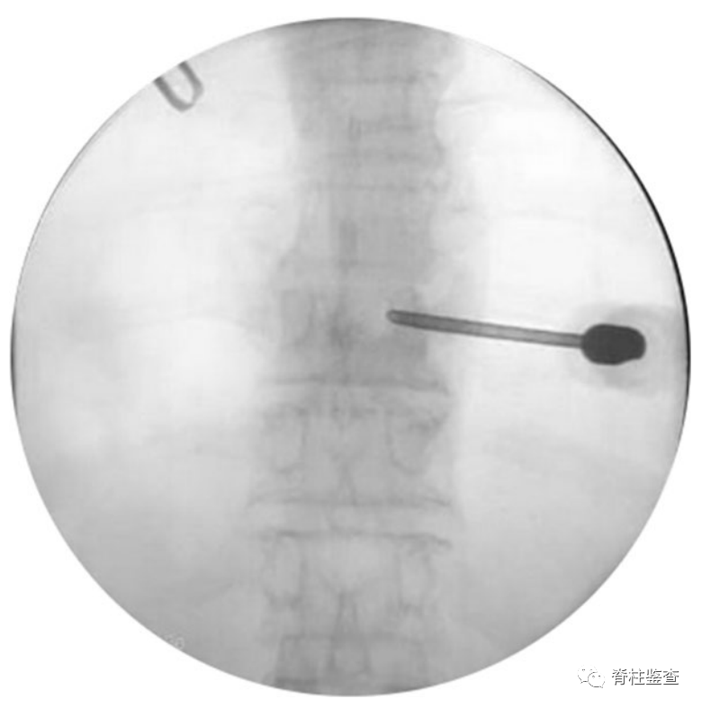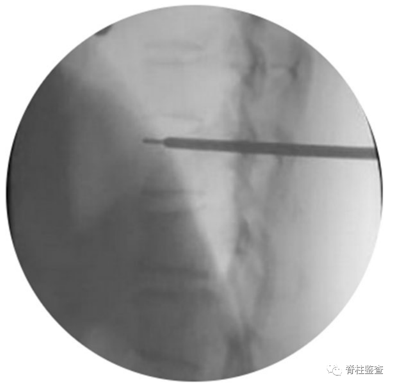 6.对于椎间盘病变,采用远外侧入路置入穿刺针。透视侧位像有助于识别关节突及椎弓根,穿刺针从关节突关节外侧进入,紧贴下位椎体椎弓根上缘,避免损伤神经根。对于椎间隙病变,最佳的目标靶点为前后位影像上两侧椎弓根连线的中点,与侧位像椎体后缘连线的交点。