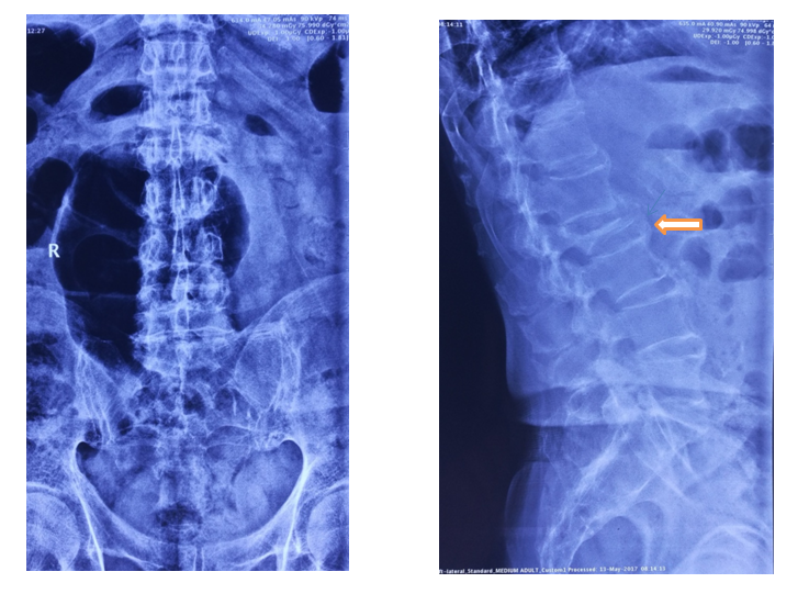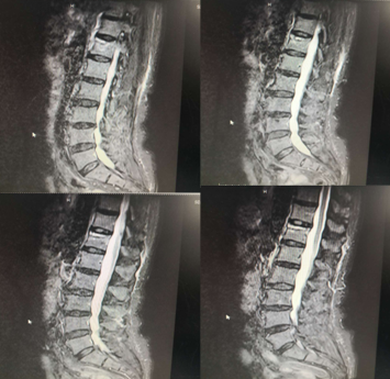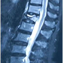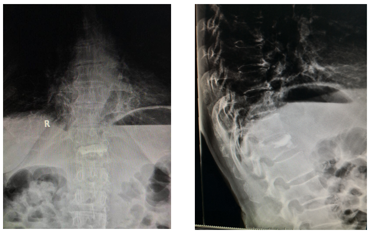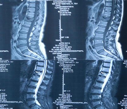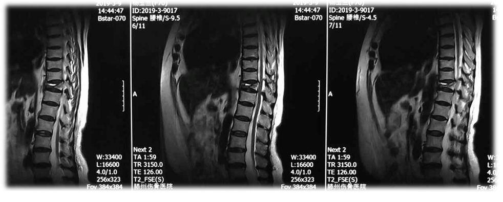 胸腰椎后凸畸形,胸腰段棘突压痛叩击痛,双下肢无明显放射痛。双下肢屈髋肌力5级,屈伸膝肌力4级,踝跖屈背伸肌力4级,踇屈背伸肌力4级。