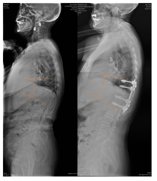 术前诊断:1.胸腰椎后凸畸形,2.重度骨质疏松症,3.Kummell病II期,4.胸椎椎管狭窄,5.黄韧带骨化症,6.高血压病。