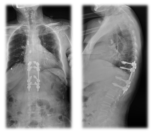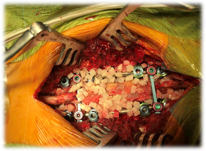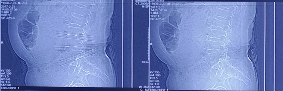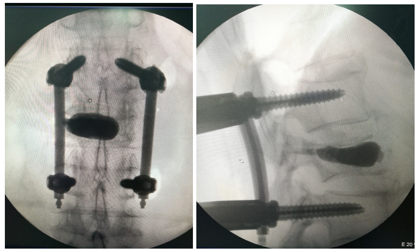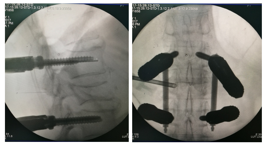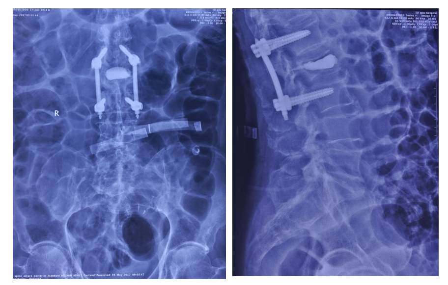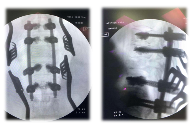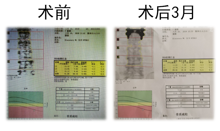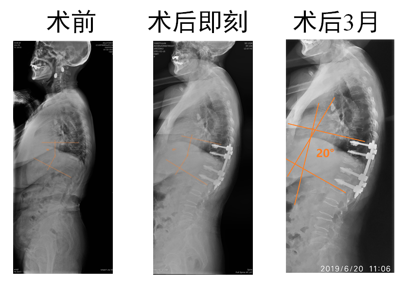 手术治疗:T10-T12棘突椎板切除;T11 截骨后凸矫形;T9-L1椎弓根固定,均为骨水泥螺钉,安放横联两根;T10/11及各椎板后方大量植异体骨及自体骨。