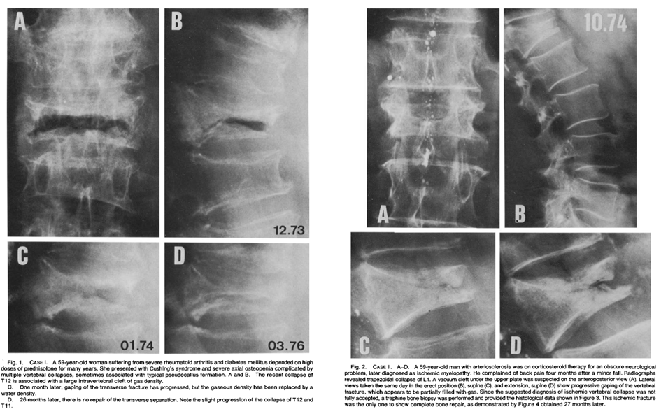 无或有轻微外伤史,骨质疏松病史,糖皮质激素使用史,进行性加重腰背痛,进行性后凸畸形,影像学真空裂隙征,排除肿瘤、感染等疾病,可作出诊断。