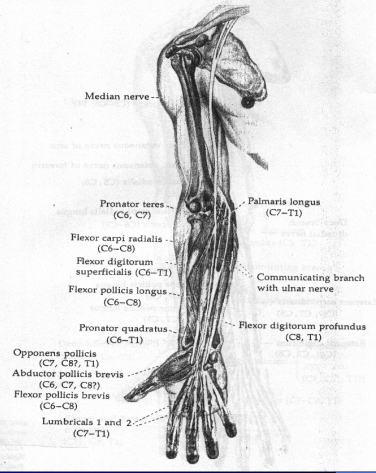 - 支配:肘上无分支,旋前圆肌、桡侧屈腕肌等前臂屈肌及手部小肌肉
