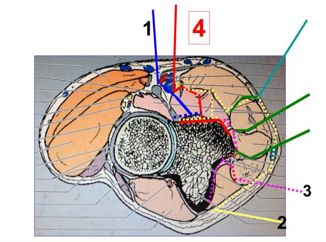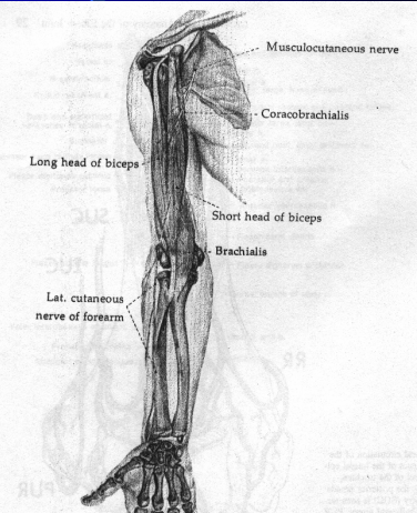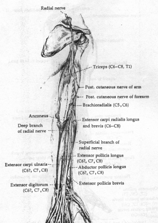 - 走行:桡神经沟---穿外侧肌间隔下1/3 --肱肌、肱桡肌间