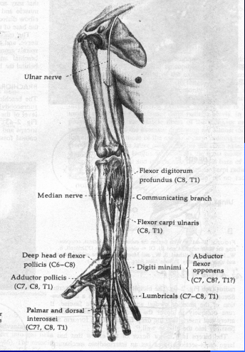 - 支配:肘上无分支,尺侧屈腕肌、环小指屈指深肌、手部14块半小肌肉