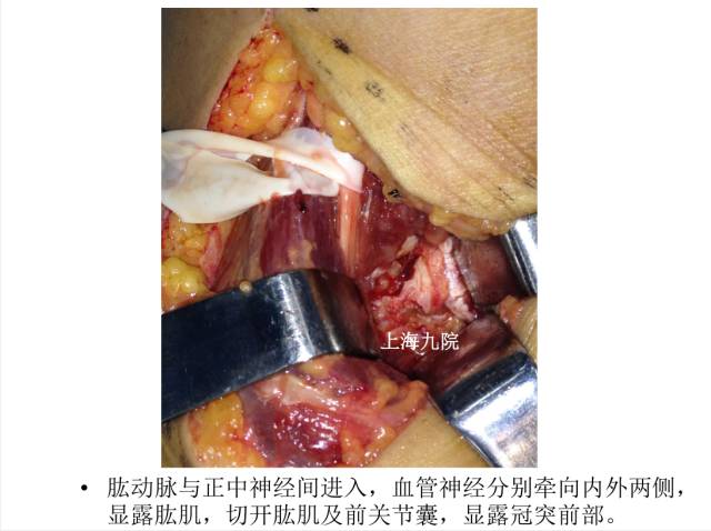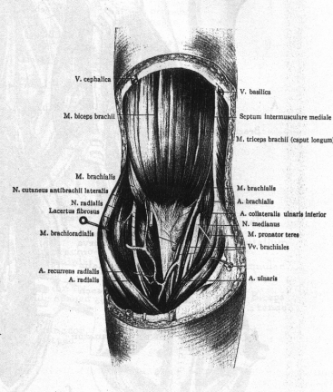 - 内容:桡神经、前臂外侧皮神经、肱二头肌腱、肱动脉、正中神经、肱肌